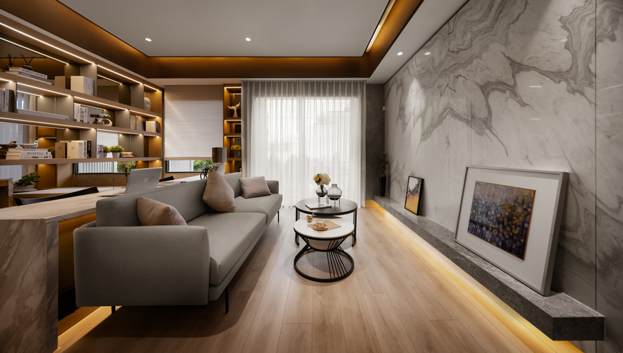 接待中心為整體建案的門面,視覺設計以現代風格為主軸,整體空間大量運用大理石紋理牆面、金屬飾條與溫潤木皮,透過深淺質材的層次堆疊搭配間接燈光設計,打造出典雅卻不失氣勢的接待氛圍。