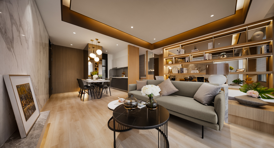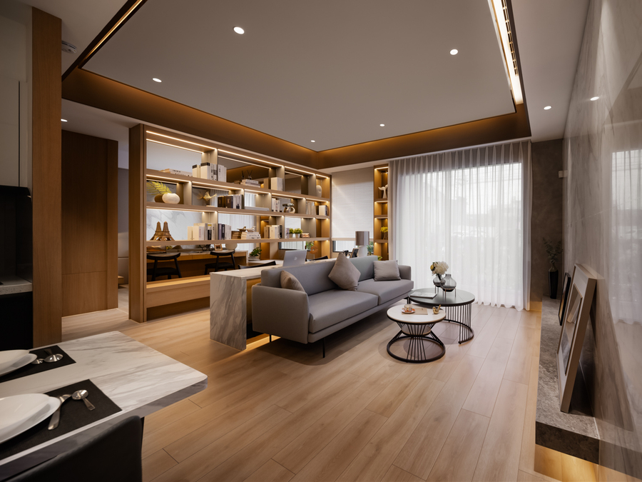 樣品屋為實際居家模擬空間,針對現代小家庭所需規劃功能,整體裝潢風格延續接待中心的現代簡約路線,但更重視機能與使用者體驗。