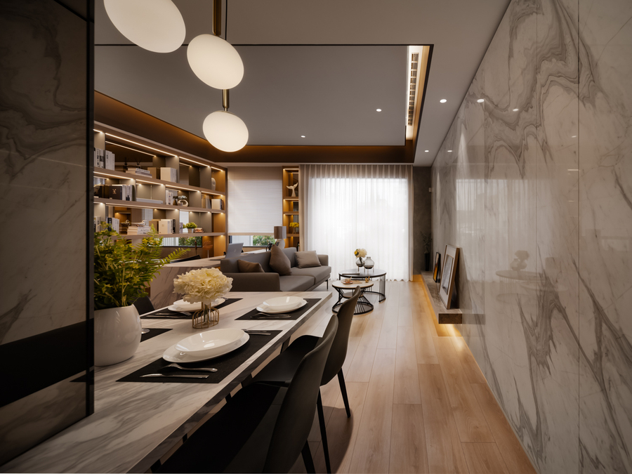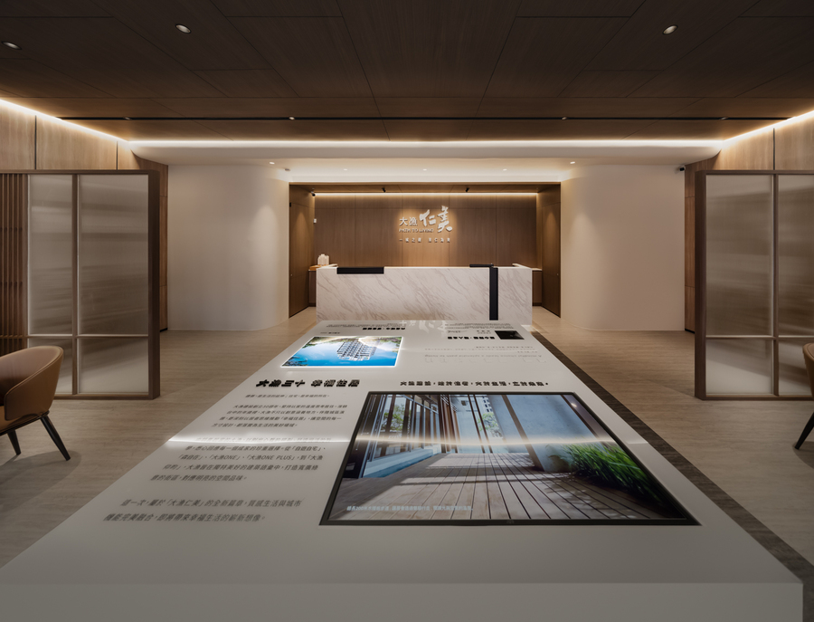 接待中心為整體建案的門面,視覺設計以現代風格為主軸,整體空間大量運用大理石紋理牆面、金屬飾條與溫潤木皮,透過深淺質材的層次堆疊搭配間接燈光設計,打造出典雅卻不失氣勢的接待氛圍。