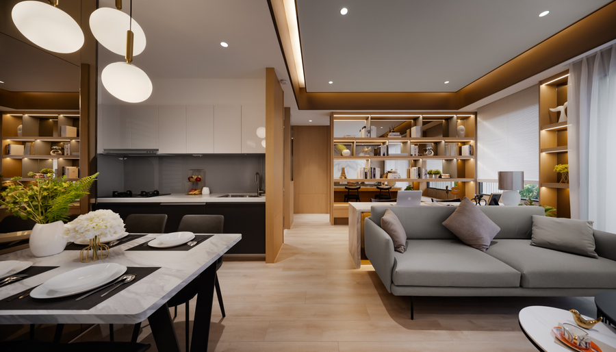 樣品屋為實際居家模擬空間,針對現代小家庭所需規劃功能,整體裝潢風格延續接待中心的現代簡約路線,但更重視機能與使用者體驗。