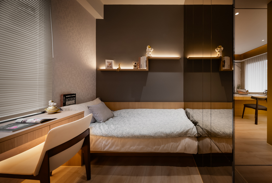 小孩房則強調閱讀與成長機能,沿窗設計書桌與閱讀區,搭配書架、層板與適宜的照明配置,提供孩童一個專注、安全且富有溫度的學習環境,也充分體現空間與家庭需求的結合。
