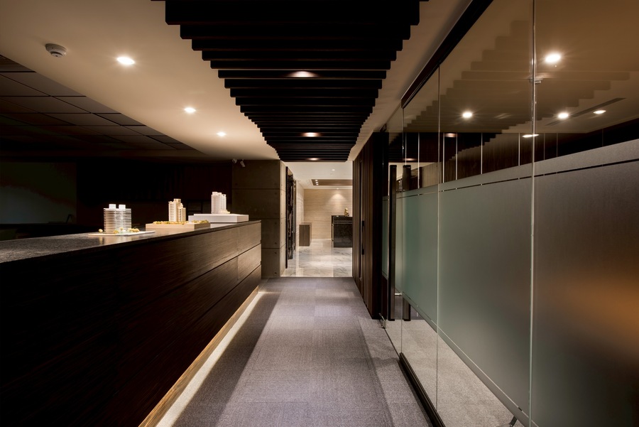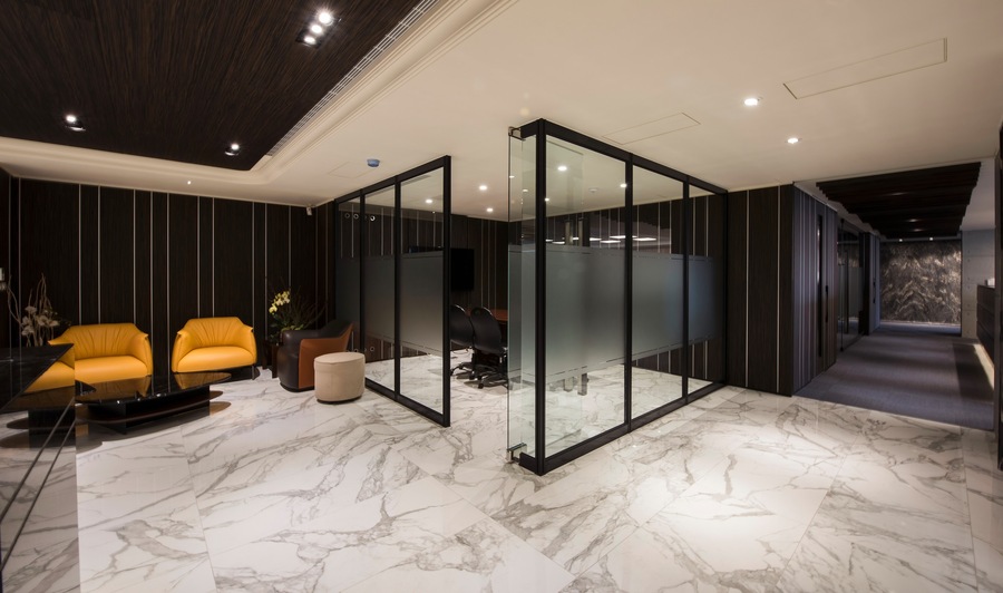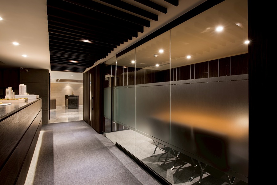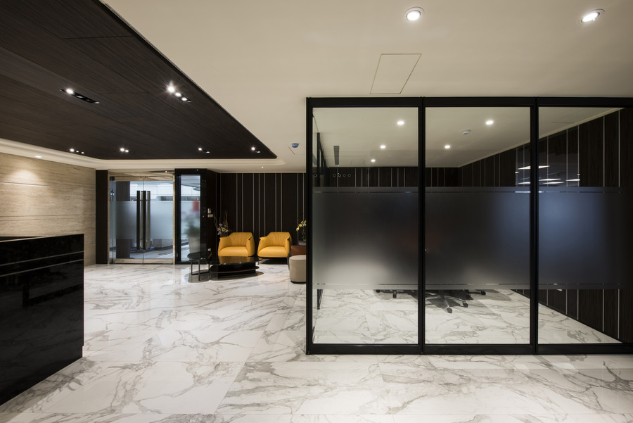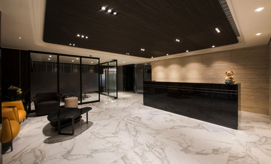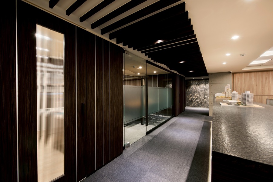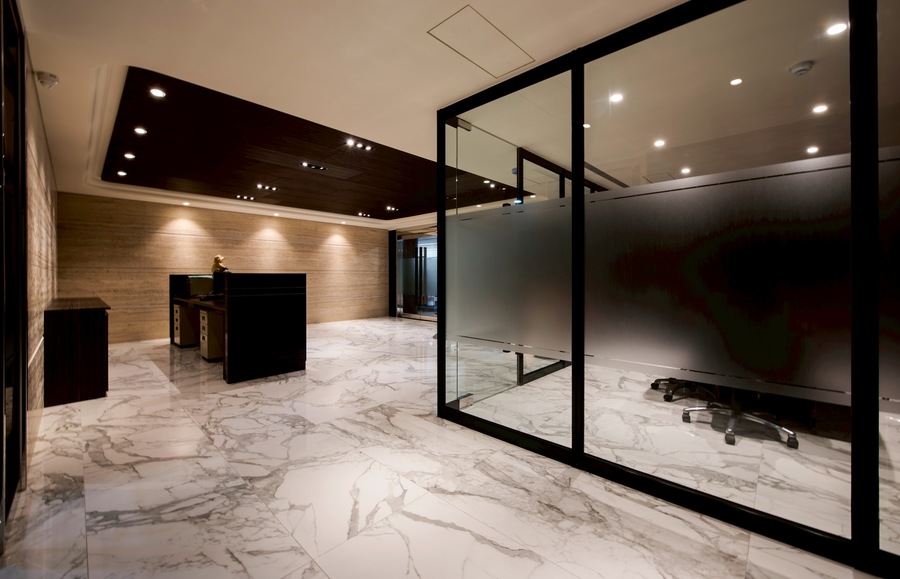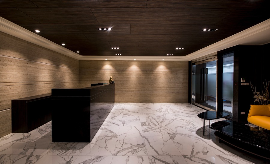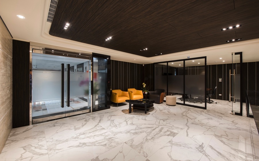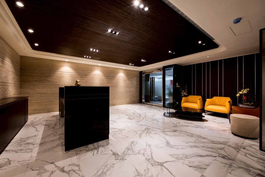 燈光策略採用嵌燈、線型燈與間接照明相結合,根據不同空間屬性設定光色與亮度,辦公區明亮清晰、會議室中性柔和、董事長室則強調光影變化帶來的尊榮氣息。入口櫃台與大廳牆面更透過光源投射展現材質肌理,建立強烈的第一印象識別。