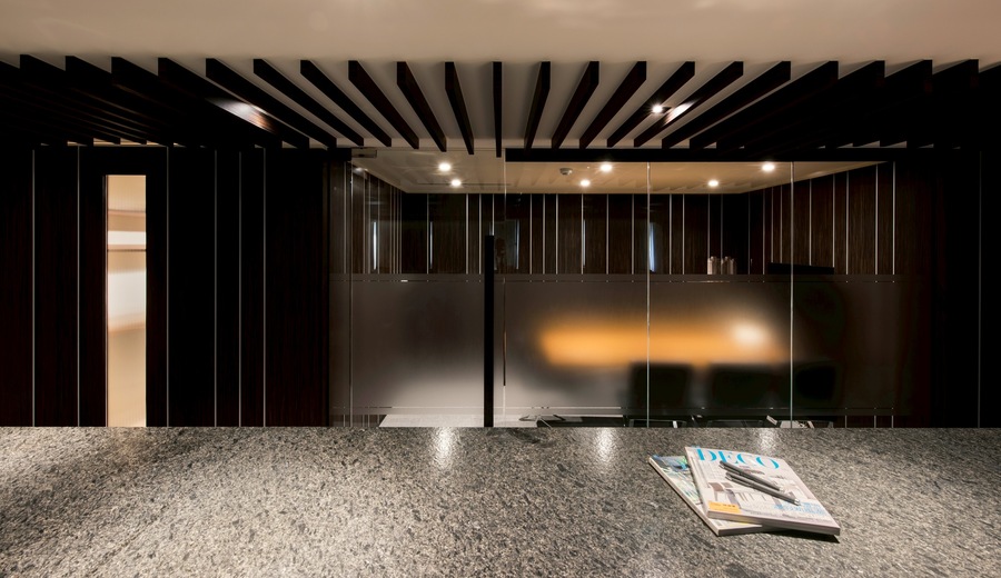 材質方面,我們大膽採用大面積胡桃木雕刻紋理作為整體空間主視覺元素,延伸於牆面、天花與訂製櫃體,營造出一致而豐富的層次感。為避免沉重壓迫感,適度搭配米色調天然石材牆面,形成視覺上的剛柔對比,讓空間在穩重中仍保有通透與溫潤。地面則區分功能性鋪材,接待區選用淺色大理石地磚,彰顯開放大器的迎賓氛圍,辦公區與會議室則採用深灰色方塊地毯,不僅提升聲學表現,也便於日後局部更換與清潔維護。