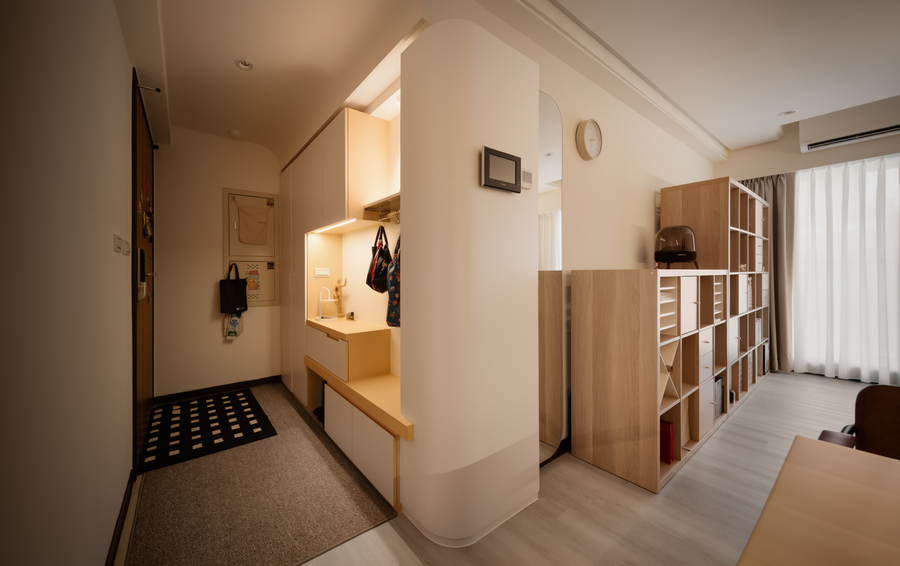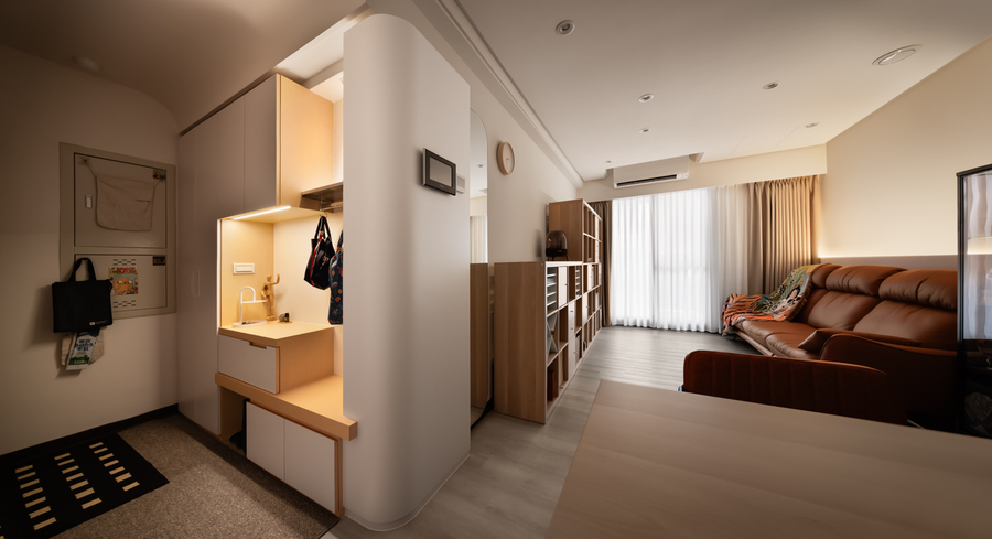 玄關設計巧思|入口處以圓弧牆面設計搭配衣帽鏡,搭配鞋櫃與掛衣空間,有效修飾轉角、消除壓迫感,展現從一進門就能感受到的簡約風格與統一視覺語言。