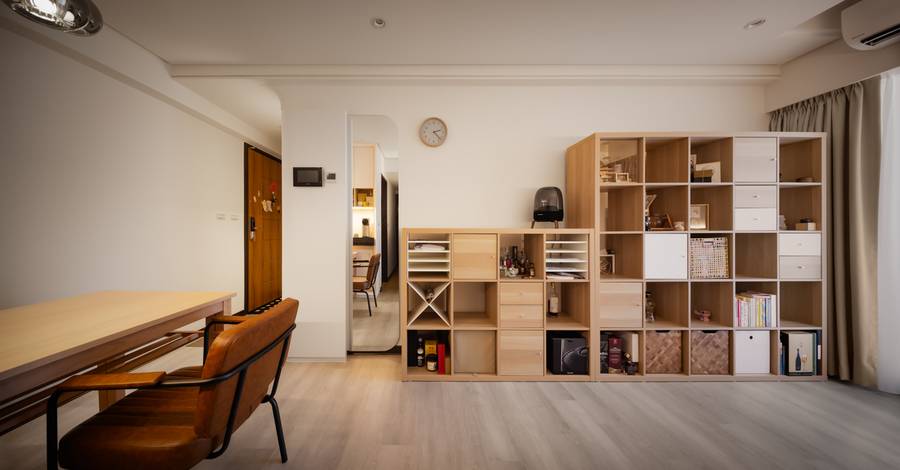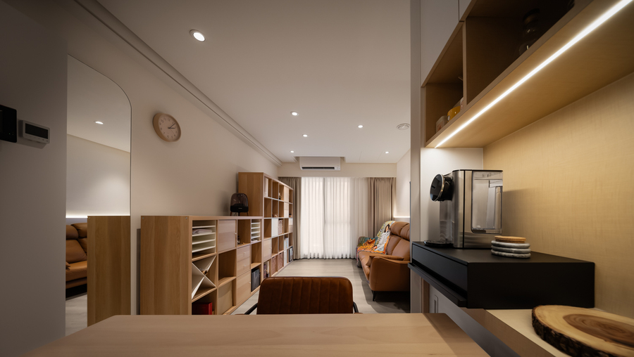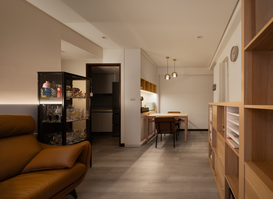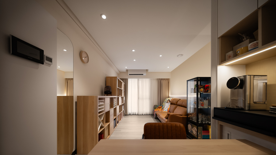 客廳不再以電視為主角,而是以層架、書櫃與收藏展示區串起日常片段;餐桌結合工作功能,營造靜心用餐與閱讀的角落;玄關則以圓弧造型與衣帽鏡收納,展現簡約而不失細節的居家設計思維。