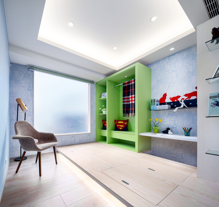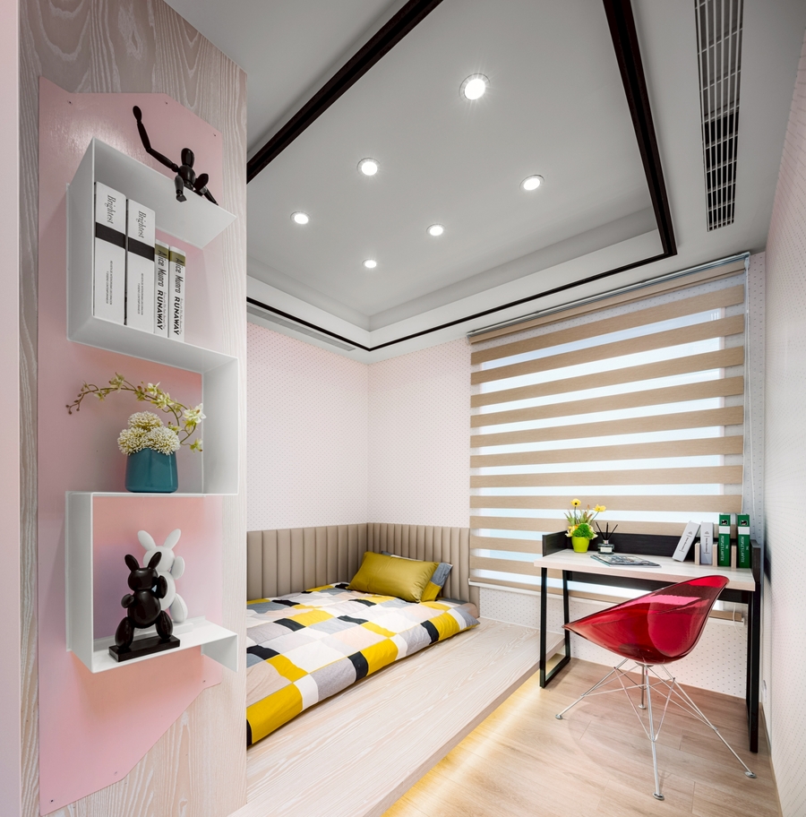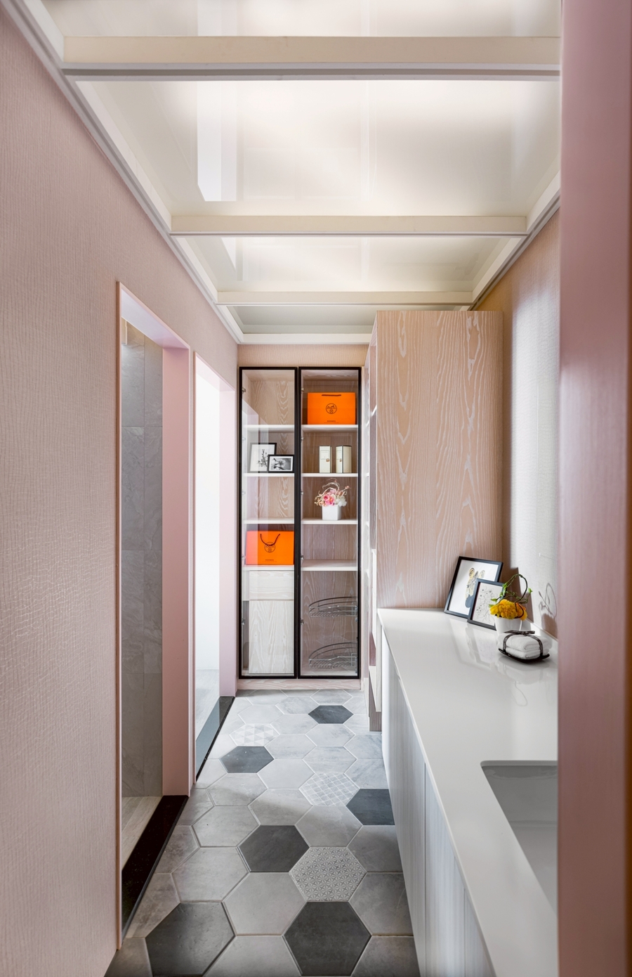 在空間設計上,挑高的接待大廳成為視覺主軸,建設公司案名被巧妙地嵌入至內牆高處位置,以莊重且簡潔的手法強化品牌記憶點,也讓來訪者一眼即可感受到企業的格局與信念。