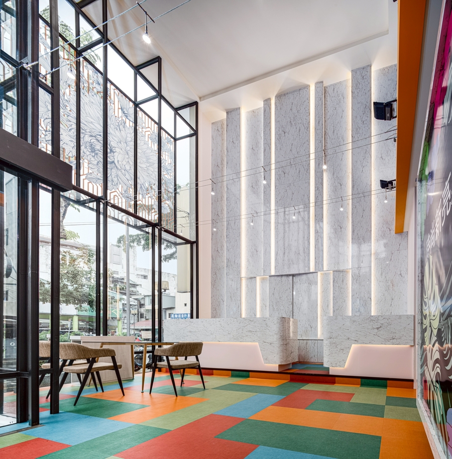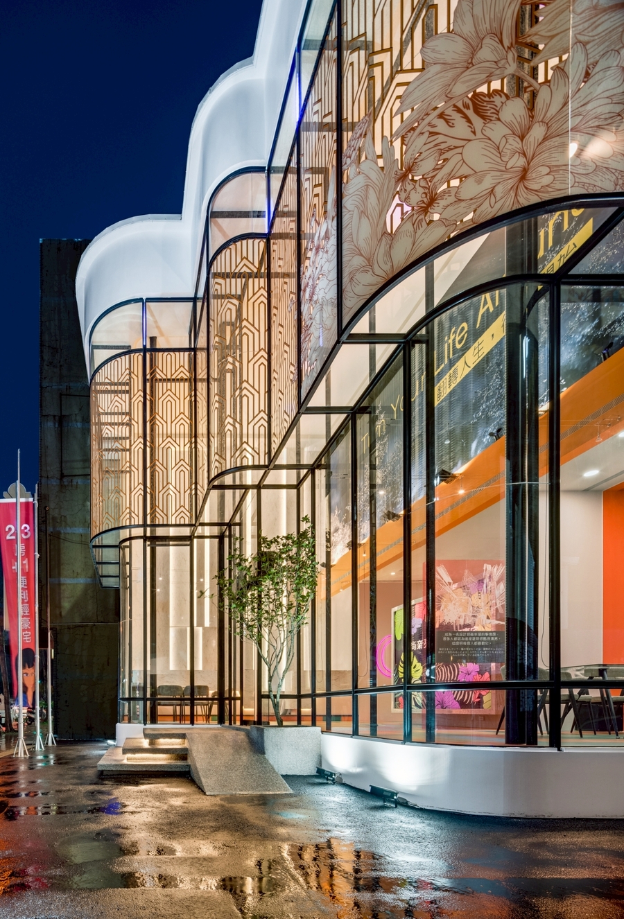 建築外觀則展現出強烈的結構美學,採用5×5公分金屬ㄇ型鐵雙併成H型鋼構件作為立面骨架,呈現穩固、現代且具工藝感的外觀骨幹。搭配彎曲與平板玻璃相互交錯組合,不僅在視覺上展現曲線與直線的流動交織,更透過玻璃的反光與穿透感,引入自然光影,使整體建築在日間與夜間皆展現不同風貌。