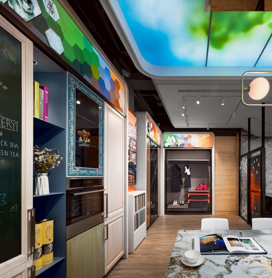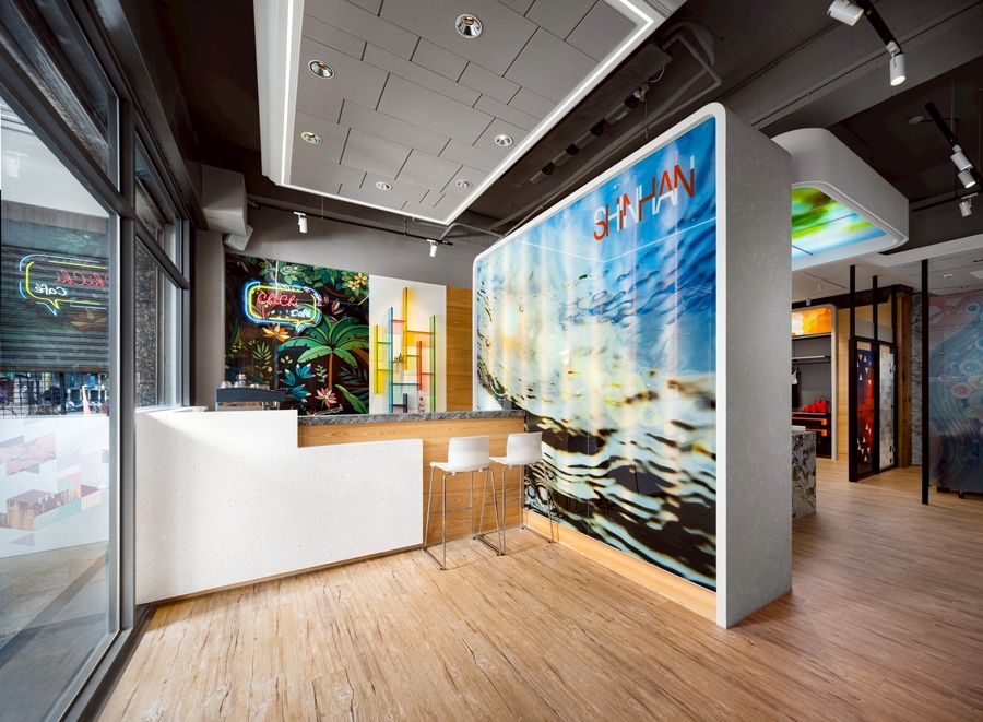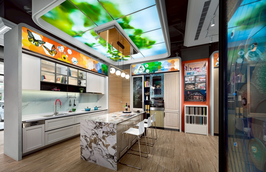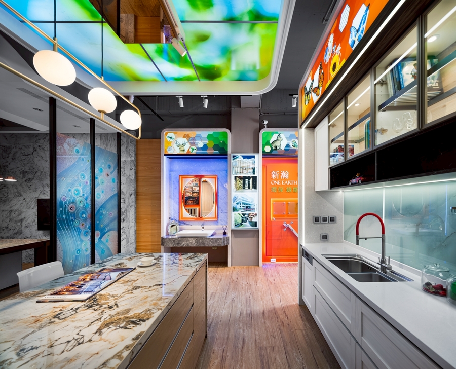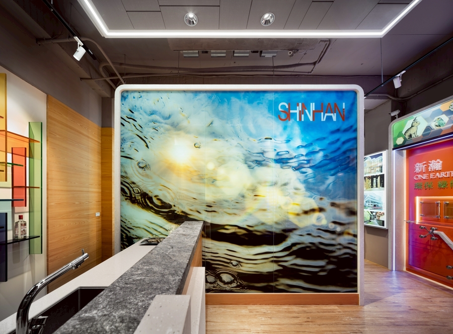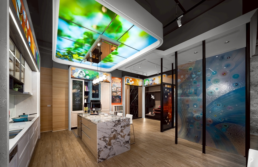 天花部分採用導光型彩釉玻璃搭配模組化燈具,隱藏式燈帶設計讓光影如天光灑落,提升空間高度感與沉浸氛圍。各功能區的空間劃分明確,吧檯接待區以仿大理石紋薄片磁磚檯面展現品牌接待專業感;中島區則模擬居家情境,讓訪客在實際使用環境中體驗玻璃抗污、防霧、抗UV等技術;系統櫃與衣櫃展示區配置隱藏光源與收納模組,展現玻璃材質在家具整合應用的實用性與美感。