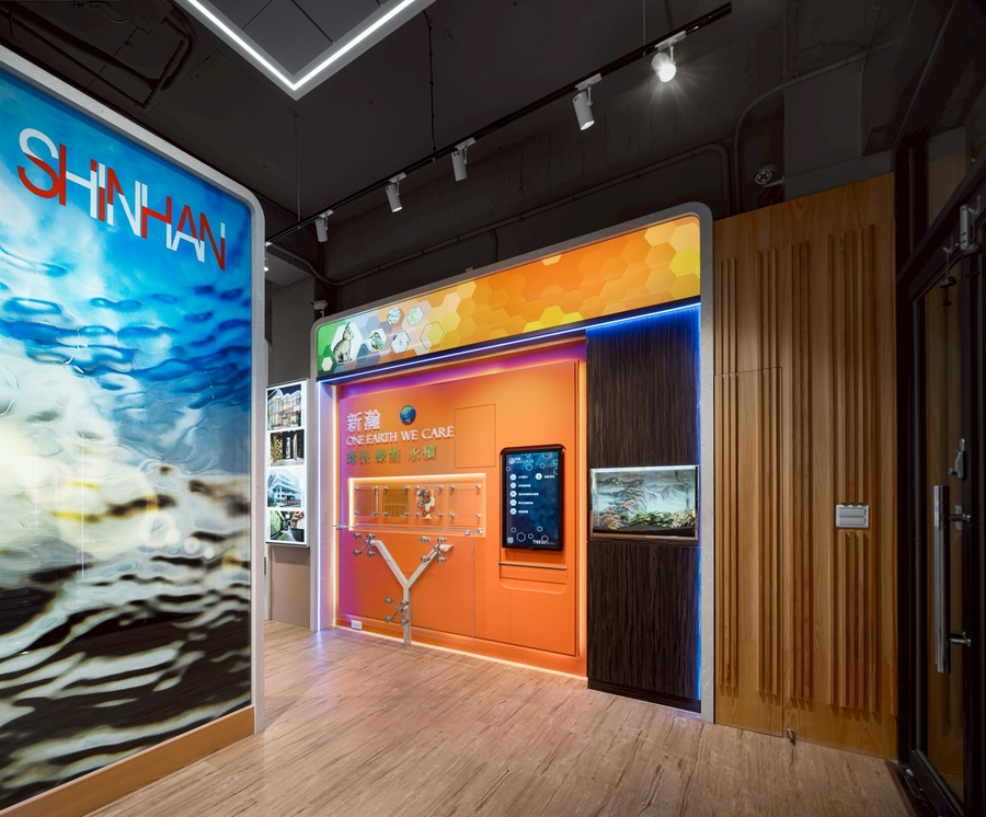 整體空間規劃以「玻璃為主角、光為媒介」作為設計出發點,導入自然意象與數位色彩作為視覺核心,結合節能、科技與藝術元素。設計師運用數位彩釉玻璃製作牆面與天花主視覺,以流動水紋與植物圖騰象徵自然能量流動,與品牌節能理念呼應。牆面玻璃透過橘色品牌色點綴LOGO字樣,讓整體展間在科技氛圍中保有親和力。