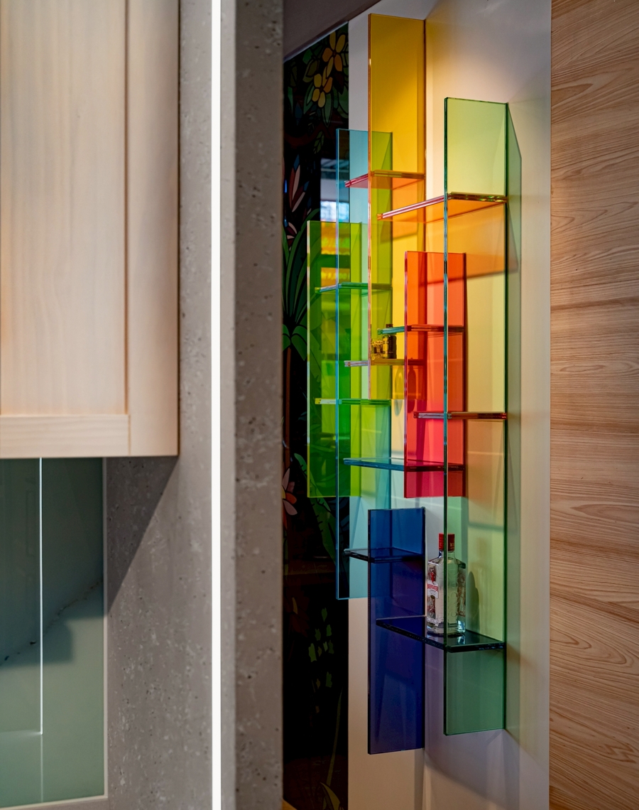在前期階段,施工團隊針對空間結構進行拆改與基礎建設配置,包含水電預埋、照明配線、玻璃定位鋁軌施工、設備出線及空調風口整合,務求每一項隱蔽工程皆精準落位。針對彩釉玻璃部分,設計團隊與玻璃供應商進行多次樣本測試,確認色彩飽和度、圖層疊印效果與導光性,並進行安裝預試組裝,以確保現場成品完全貼合預期畫面。